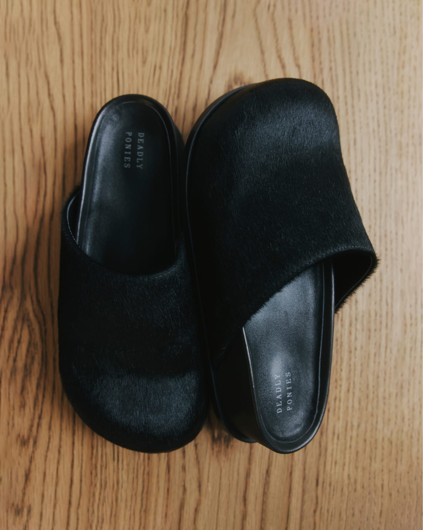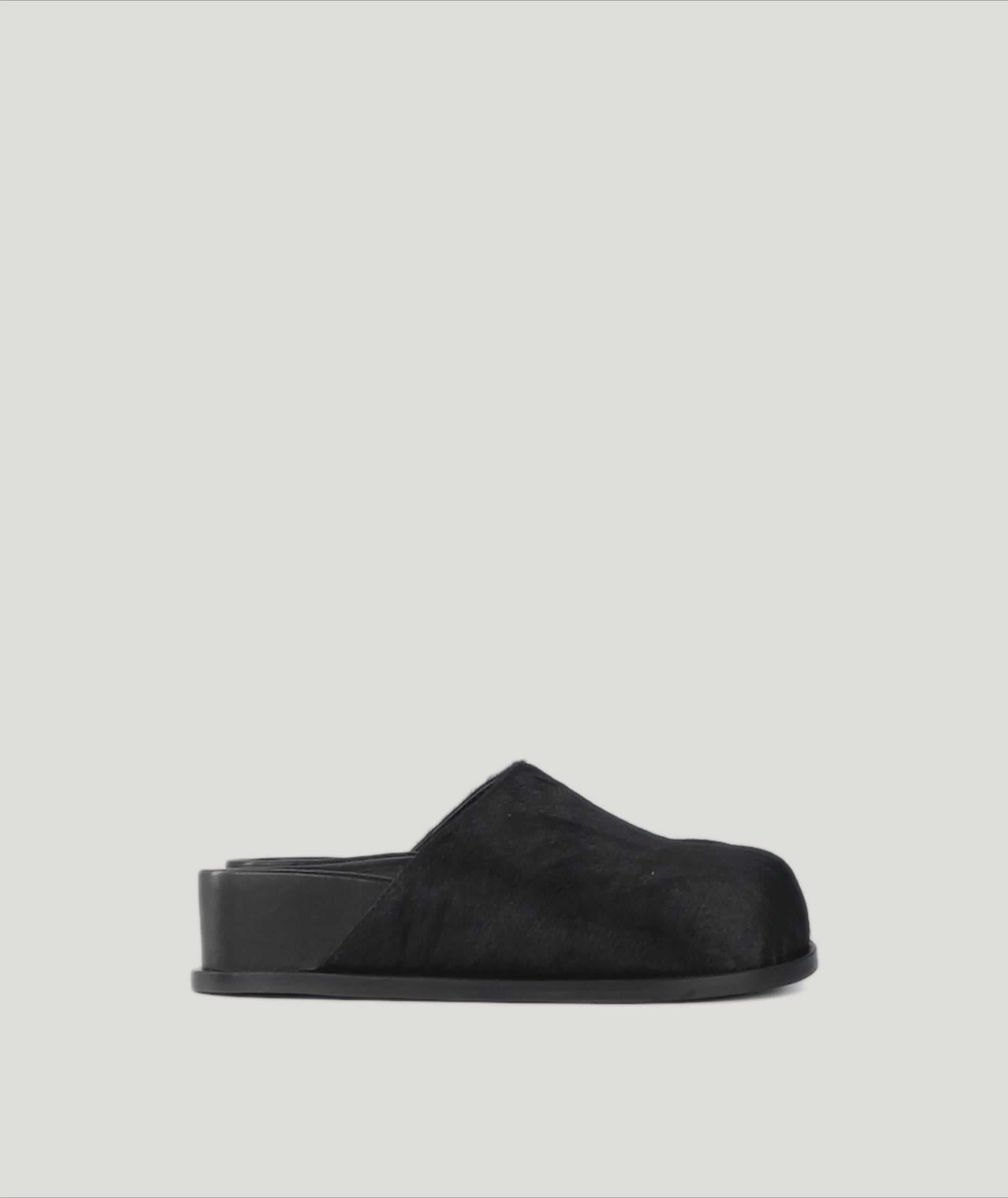 Alastor Slide in moulded Black Calf Hair, handcrafted with a Lamb Nappa lining. Features a 4cm platform and rubber sole for lasting comfort.