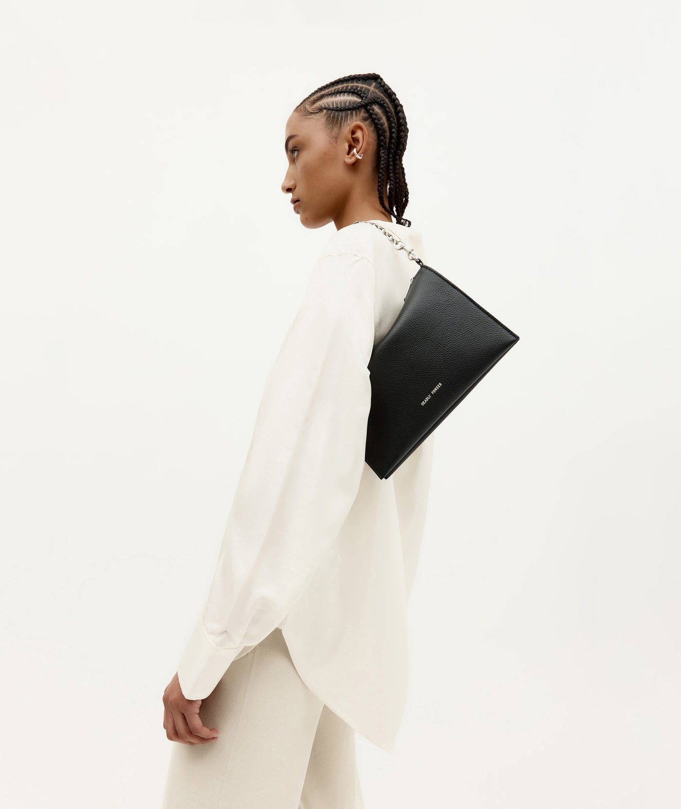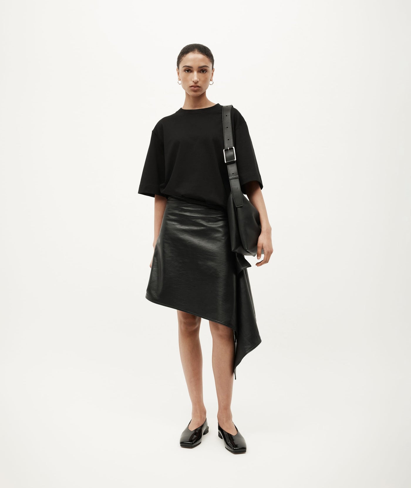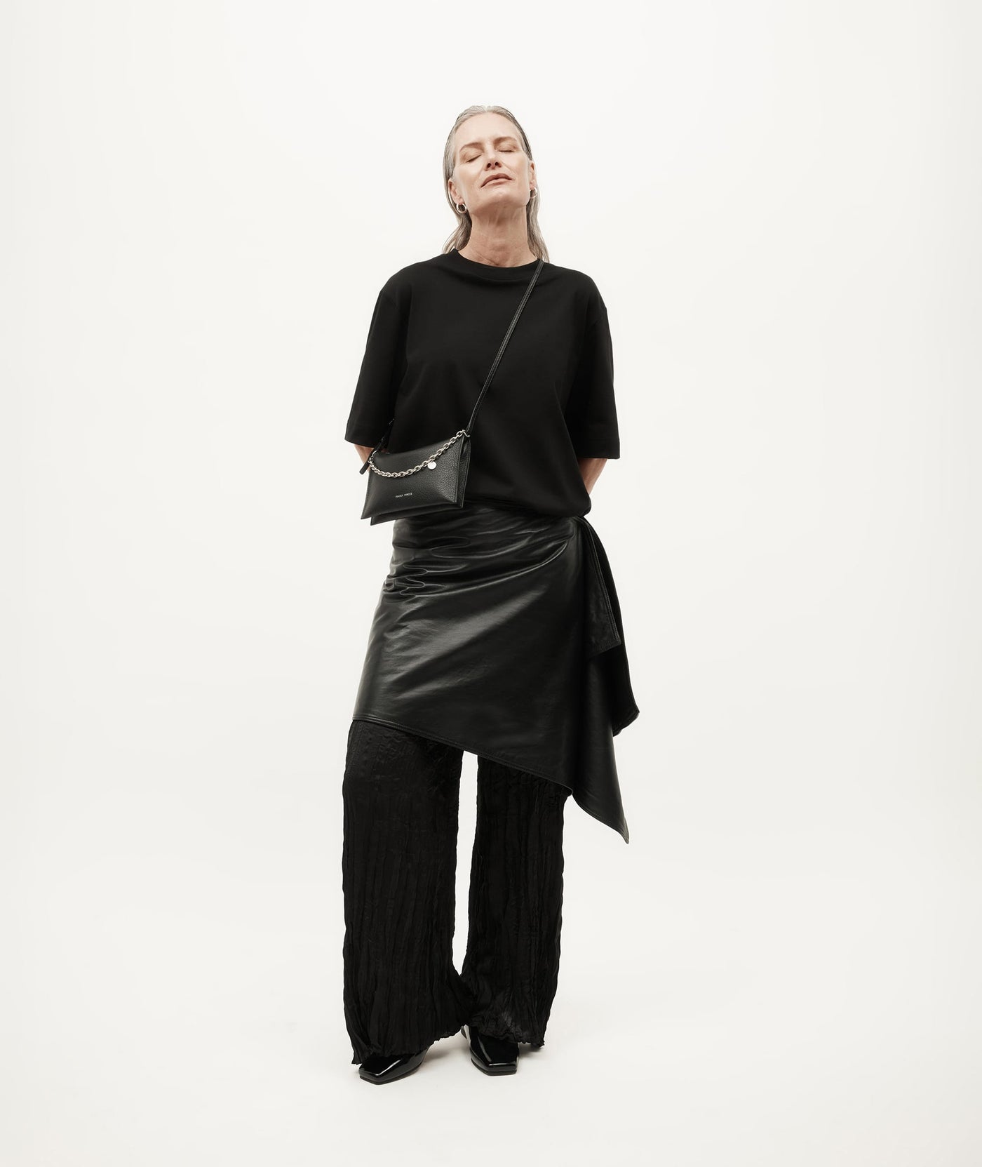 Diomedes Flat pairs a moulded square toe with two elasticated straps, a pull tab, and a rubber sole. Crafted in new Perforated Lamb Nappa in Black with brass hardware, the leather is precision-perforated for a lightweight feel and tactile finish.