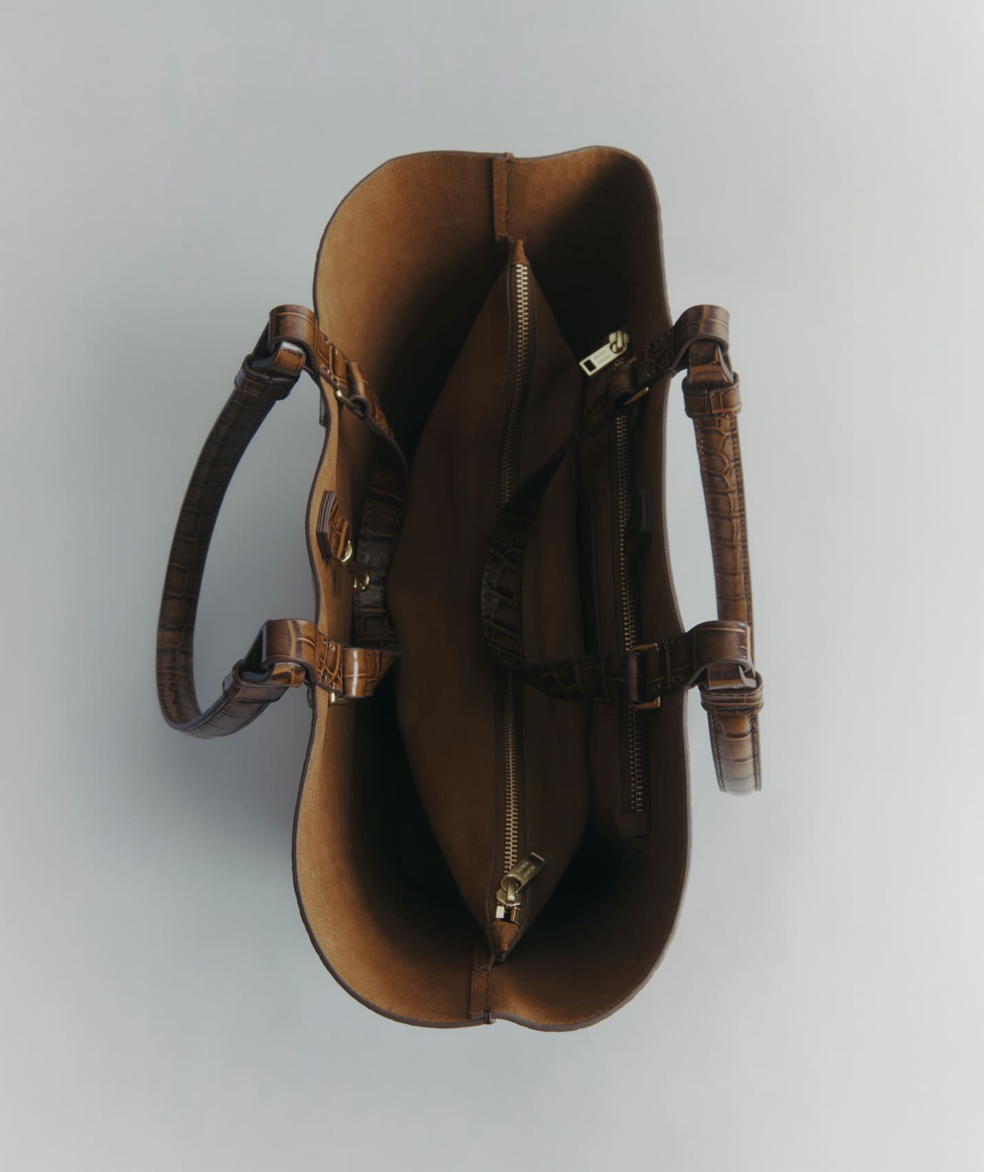 Mr Bandit Tote in Toffee is crafted in LWG-certified Croc-Embossed Calf Leather with a Gingerbread Suede interior. Carry him by hand or on the shoulder with collapsible short and long leather loop handles.