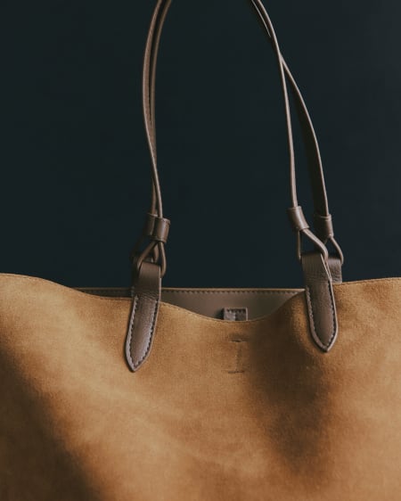 Calf Suede trimmed with Calf Nappa, REACH Certified Cotton Lining, Brass Hardware.
