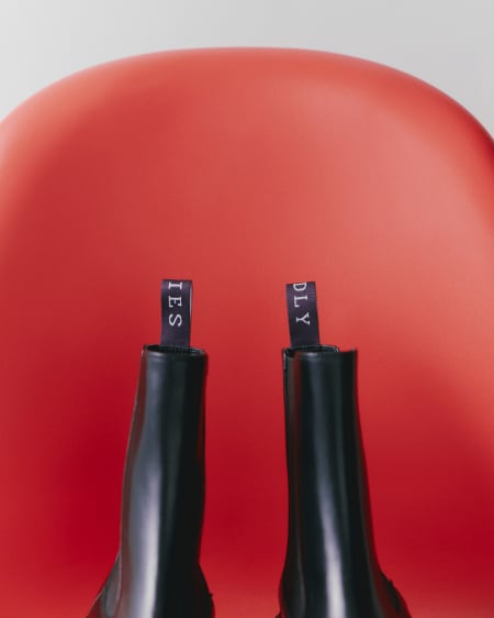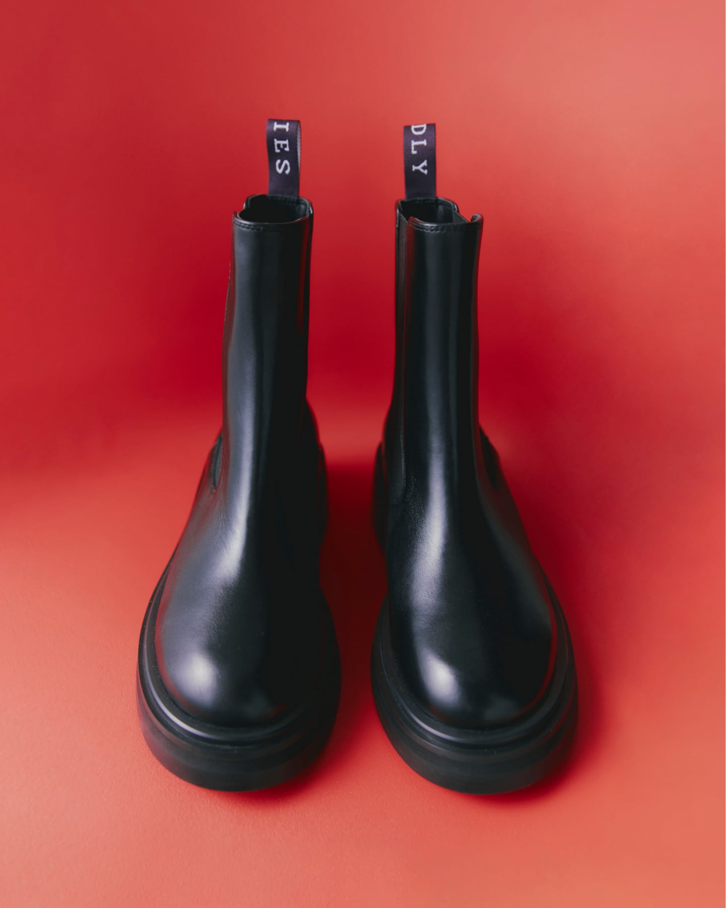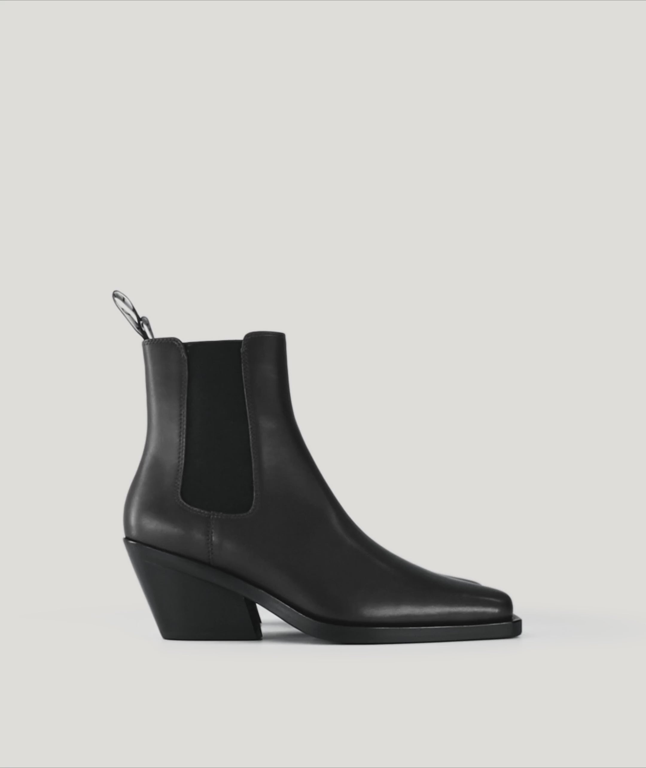 Rider Boot reimagines the classic Chelsea with a leather Cuban heel and square-toe silhouette. Crafted from Calf Nappa in Black with a Lamb Leather lining, he features signature Deadly Ponies pull tabs, a blind DP embossment on the sole, and elastic inserts for comfort.