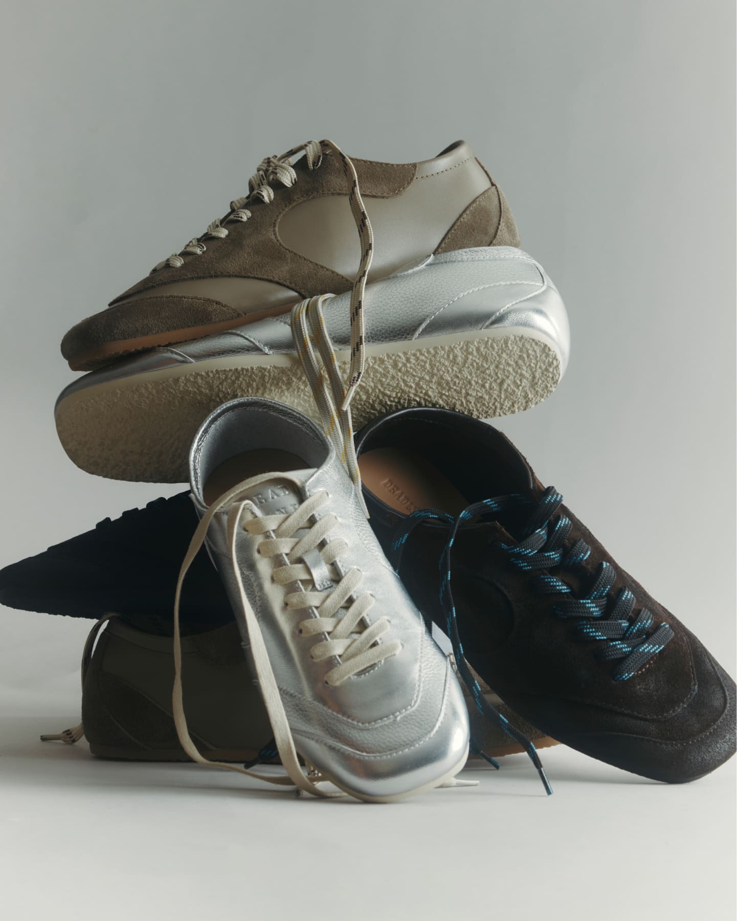Road Rider in Donkey pairs Calf Suede with Lamb Nappa contrast, sourced from LWG-certified suppliers. Featuring a panelled upper, squared almond toe, and unlined construction for effortless movement, on a durable grooved rubber sole. Includes two pairs of laces.