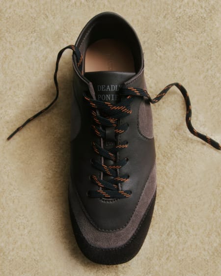 Calf Suede Upper trimmed with Lamb Nappa, Lamb Nappa Insole, Rubber Sole.