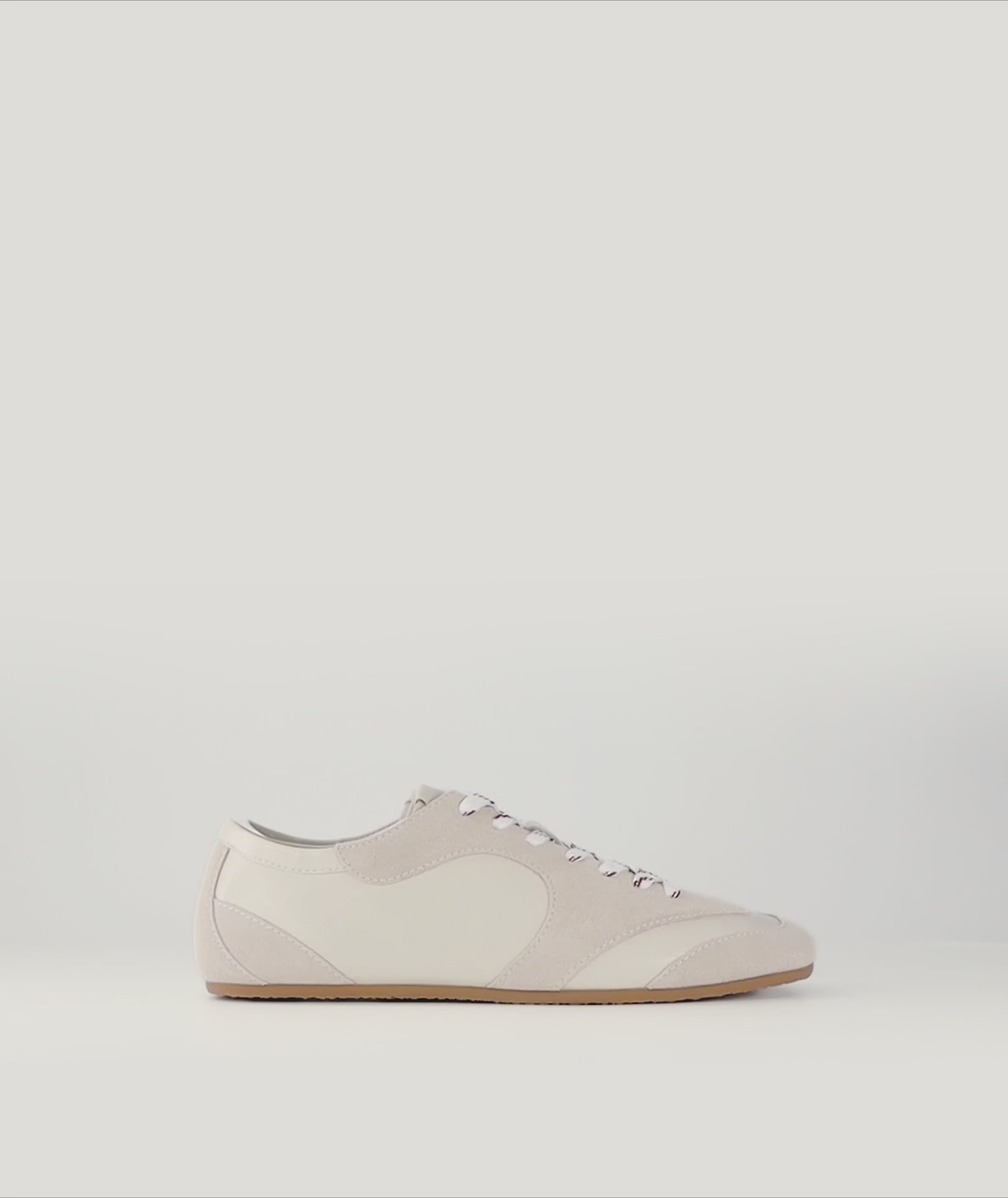Lightweight and soft, Road Rider in Milk pairs Calf Suede with Lamb Nappa contrast. Featuring a paneled upper, squared almond toe, and unlined construction for effortless movement, on a durable grooved rubber sole. Includes two pairs of laces.
