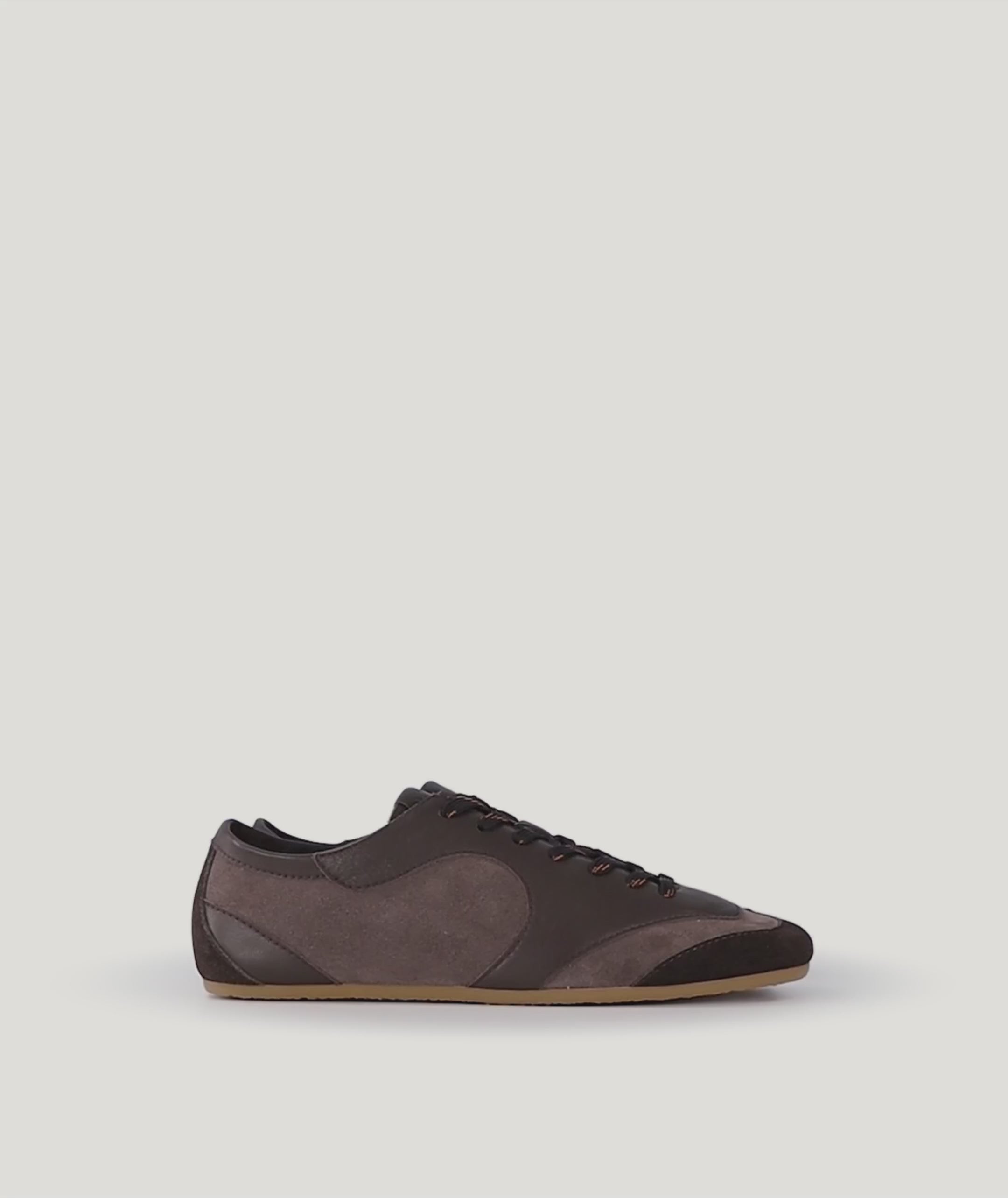 Lightweight and soft, Road Rider in Mud pairs Calf Suede with Lamb Nappa contrast. Featuring a paneled upper, squared almond toe, and unlined construction for effortless movement, on a durable grooved rubber sole. Includes two pairs of laces.