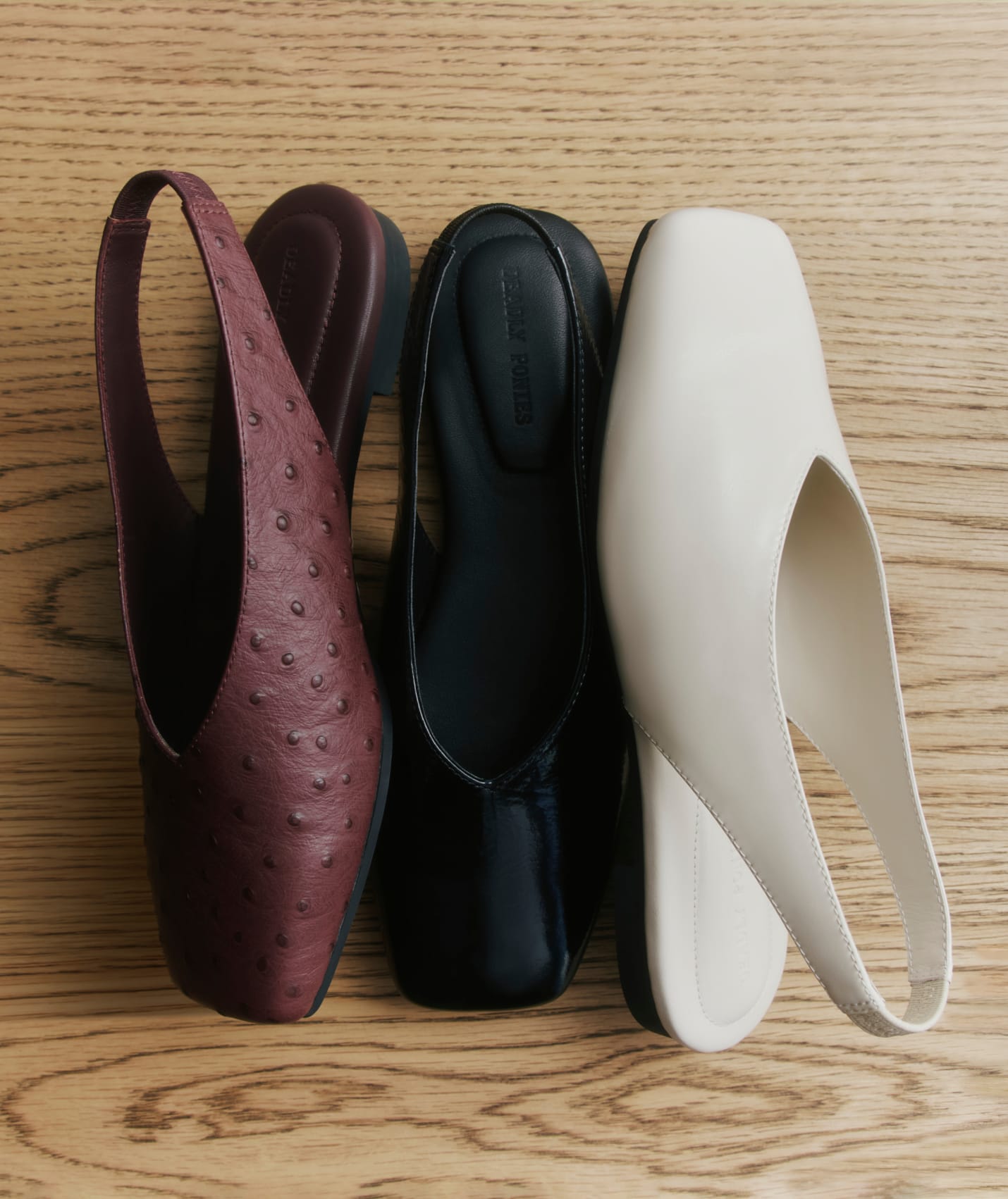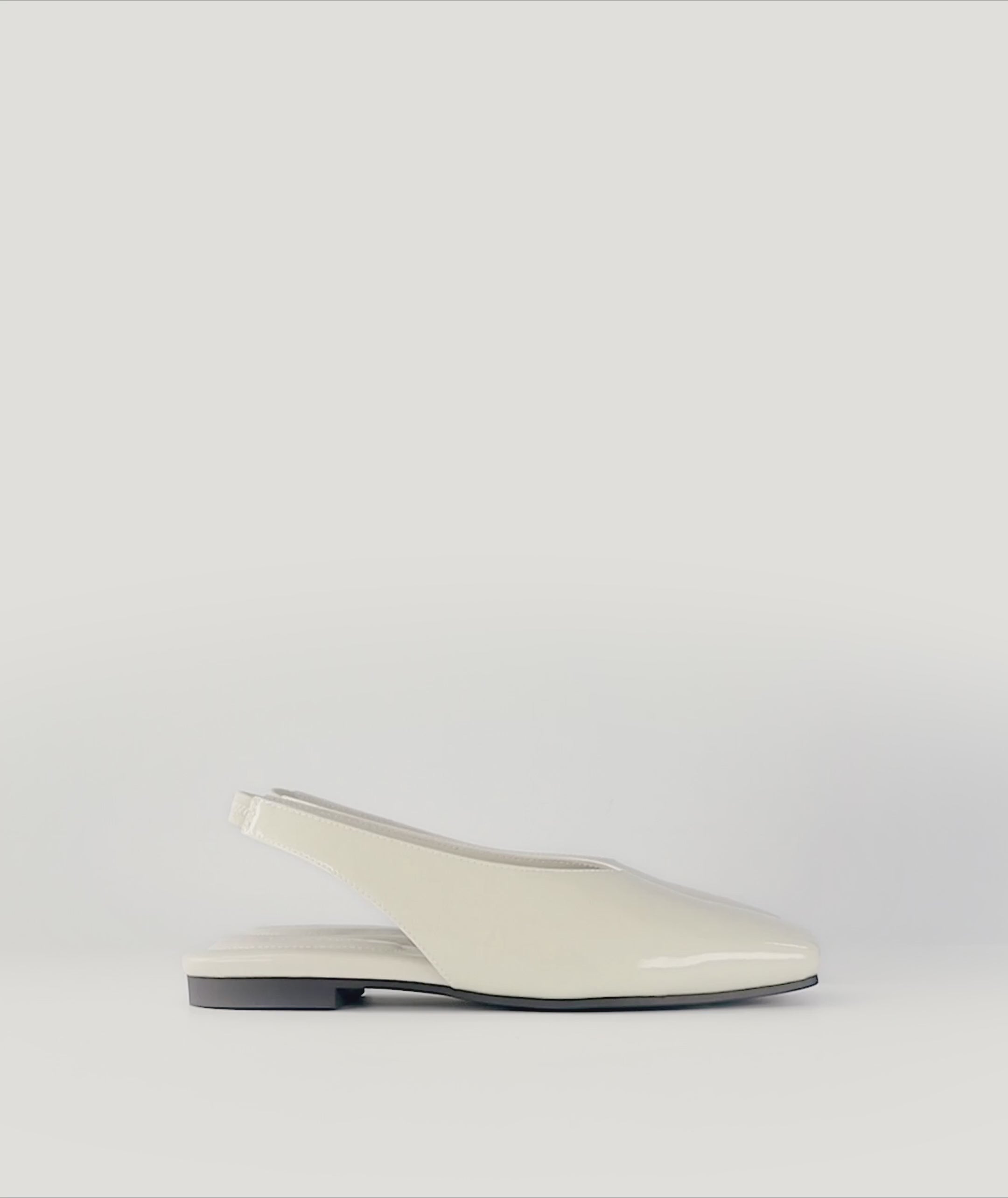 Saddleback Flat in glossy Milk Crushed Calf Patent features a square-tip toe with V-cut detail, an elasticated back strap, and a padded footbed. Finished with a durable rubber sole and low heel for lasting comfort.